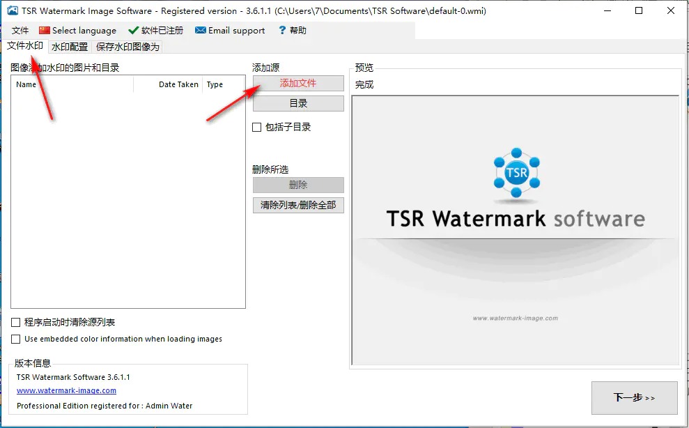 界面中文化后,点击下方的 “添加” 按钮。您可以根据需要选择添加“文字水印”或“图片水印”。